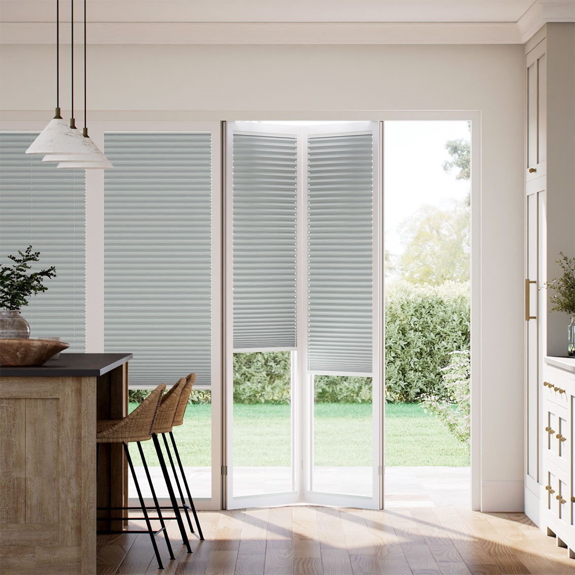 In a delicate blue-grey tone, the BiFold ClickFIT DuoShade Turtle Dovee Pleated Blind is ideal for those wanting a cool wash of colour at their bifold doors.