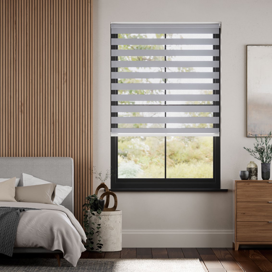 Not forgetting, you are ensured pristine privacy combined with a shading solution adjustable to you. Simply move the panels to your desired shading and receive optimal privacy day and night or even a gorgeous soft glow through its voile panels.