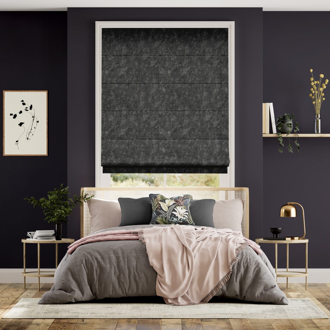 Reminiscent of midnight skies or the last remnants of fireside warmth, the intricate slubs and weaves of this design pair with its mottled finish to create a black Roman blind with tactile texture in abundance.